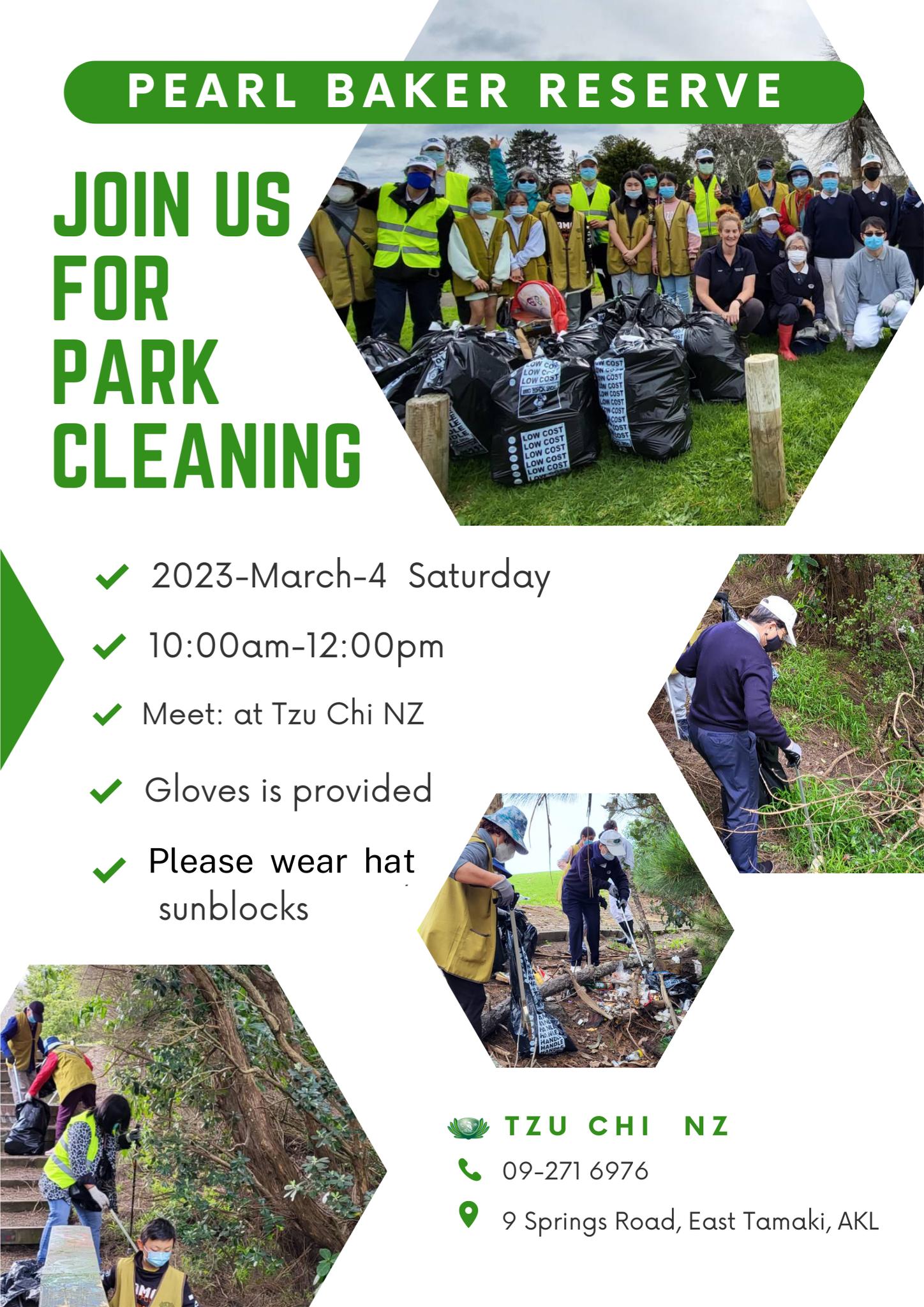 紐西蘭慈濟基金會(Tzu Chi NZ)在珍珠貝克保護區(Pearl Baker Reserve)舉辦公園清潔活動的公告,主要資訊如下: