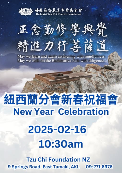 紐西蘭慈濟基金會舉辦「新春祝福會」 活動名稱:: 紐西蘭分會新春祝福會(New Year Celebration)。活動日期與時間:: 2025年2月16日上午10點30分。舉辦地點:: 紐西蘭慈濟基金會(Tzu Chi Foundation NZ),地址為9 Springs Road, East Tamaki, AKL。聯絡電話:: 09-271 6976。 在 Facebook 分享 在 X (Twitter) 分享 在 Line 分享